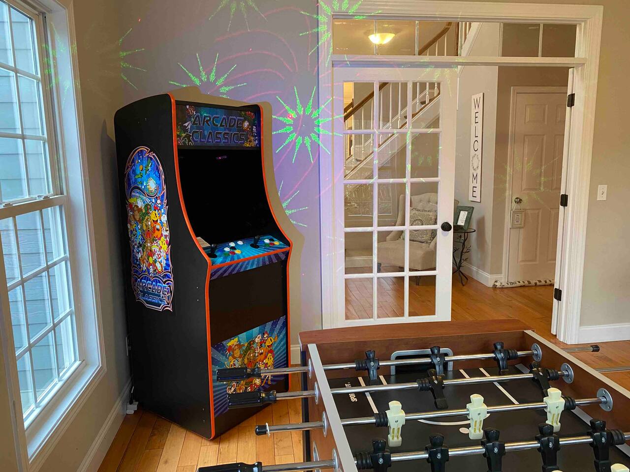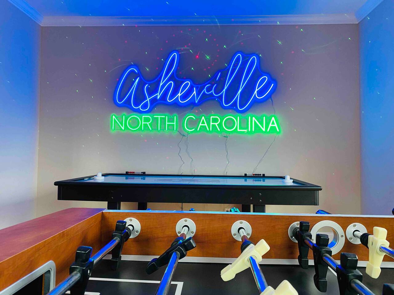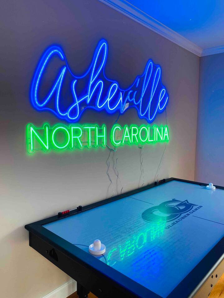 Your upscale home-away-from-home is an easy drive and perfectly located near downtown (8.9 miles, 4 turns/ no highways), The Biltmore Estate (7.1 miles, 3 turns/ no highways) and the Blue Ridge Parkway (2.9 miles). Lounge around on the large couch and watch movies on the Roku TV by the warm fireplace. Play a retro arcade game or challenge a friend to an air hockey or foosball match in the cool neon glow of the game room. Go outside to enjoy the giant swing, zip line, and ninja course!